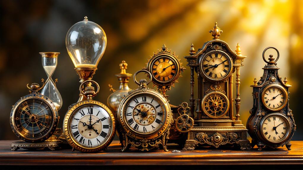 In regions where sunlight wasn't consistent, especially at night, you might have turned to water clocks. These ingenious devices, known as clepsydras, offered a reliable alternative. They work by measuring time through the regulated flow of water from one container to another. Cultures from Greece to China adopted and perfected water clocks, showcasing human ingenuity in overcoming natural limitations. As you probe into these early timekeeping methods, you see how they laid the foundation for more sophisticated timekeeping devices. Both sundials and water clocks demonstrate humanity's relentless drive to measure time, setting the stage for future technological advances.